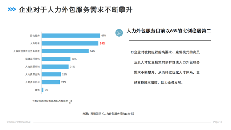 另外,还有一个就是组织敏捷。企业在快速开展的过程中,处于不断变化的环境时,面对诸多不确定因素。当业务需要快速推进,或者发现策略需要快速调整的时候,如何能做到敏捷高效、应对业务快速波动呢?企业又如何在保证业务开展的前提下,尽可能控制成本呢?所以,我们的组织要快速迭代,要敏捷,岗位外包或业务外包会是一个很好的解决方案。它能够有效提升效率、降低成本,也让组织变得更加敏捷灵活。